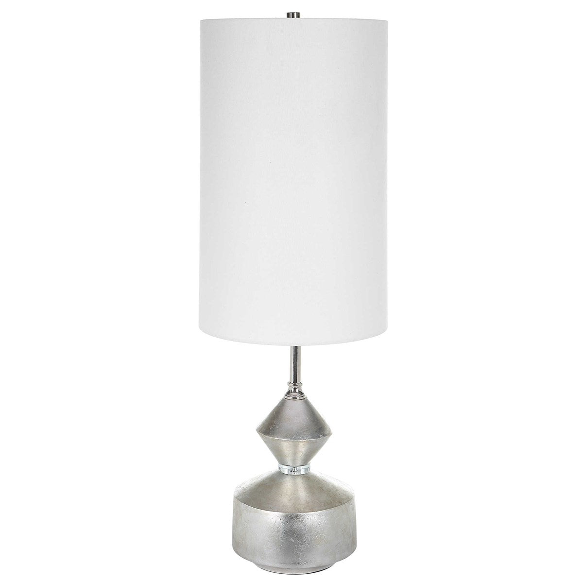 This buffet lamp takes cues from contemporary styling with its geometric shaped base with a warm silver leaf finish, accented by a polished nickel neck and crystal details. The tall drum shade is covered in a white linen fabric.