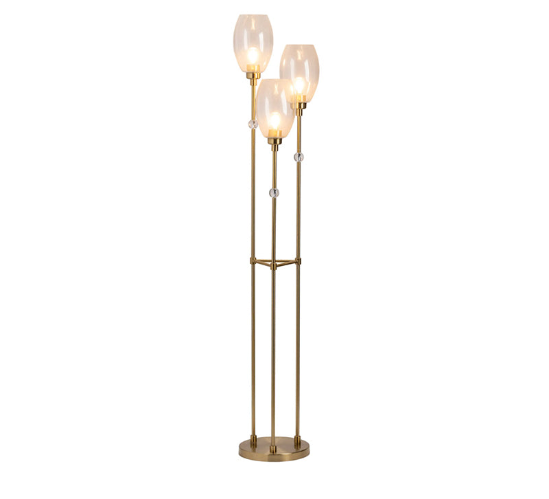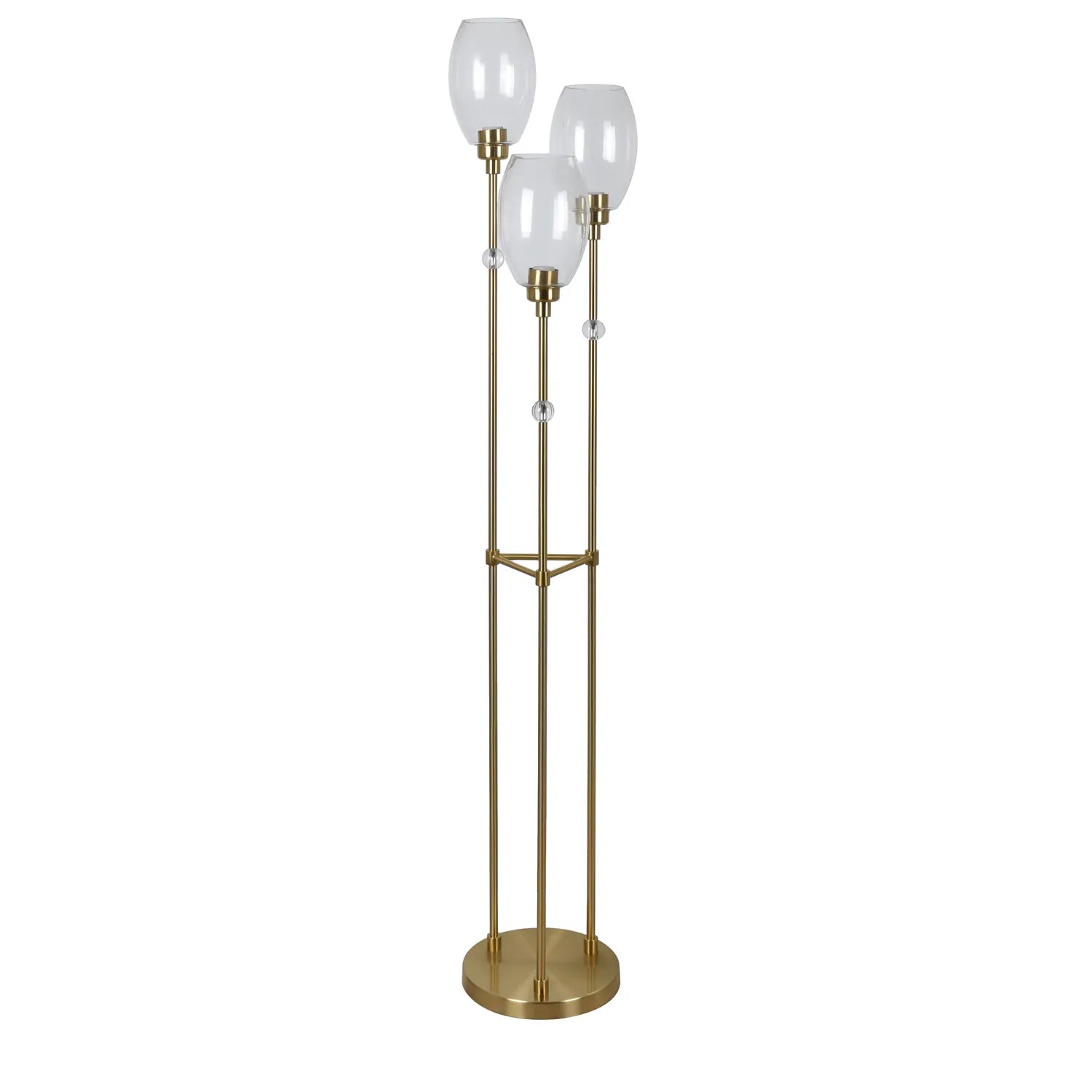 The Whitlock Triple Light Floor Lamp has a new traditional style that will give your home a refreshing look. Three uplights encased in clear glass globes sit atop antique brass stands. Each stand has a crystal ball accent and supports the lights at varying heights to give it a striking look.