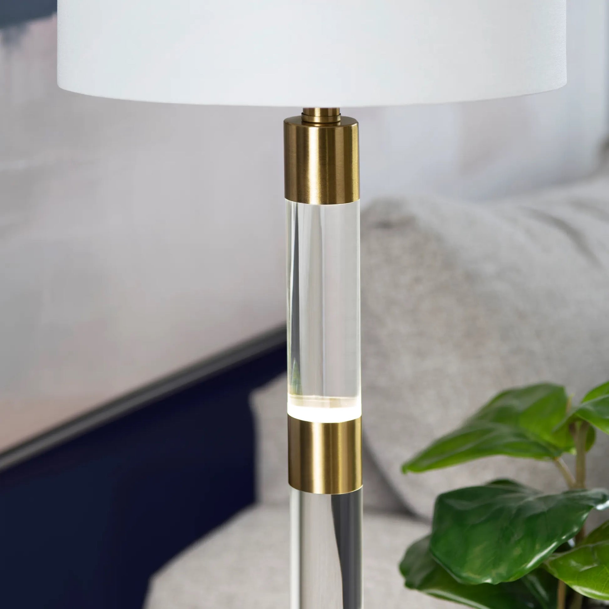 Elevate your interior with the Winslet Table Lamp by M Décore, a masterpiece of contemporary design that combines elegance with innovative functionality. Its most distinctive characteristic is a built-in nightlight that permeates the clear acrylic body with beams of light. The result is a piece that not only illuminates but also captivates with its unique charm. Complemented with a white line shade and crystal finial, this lustrous gold lamp is sure to be the conversation piece in your home.