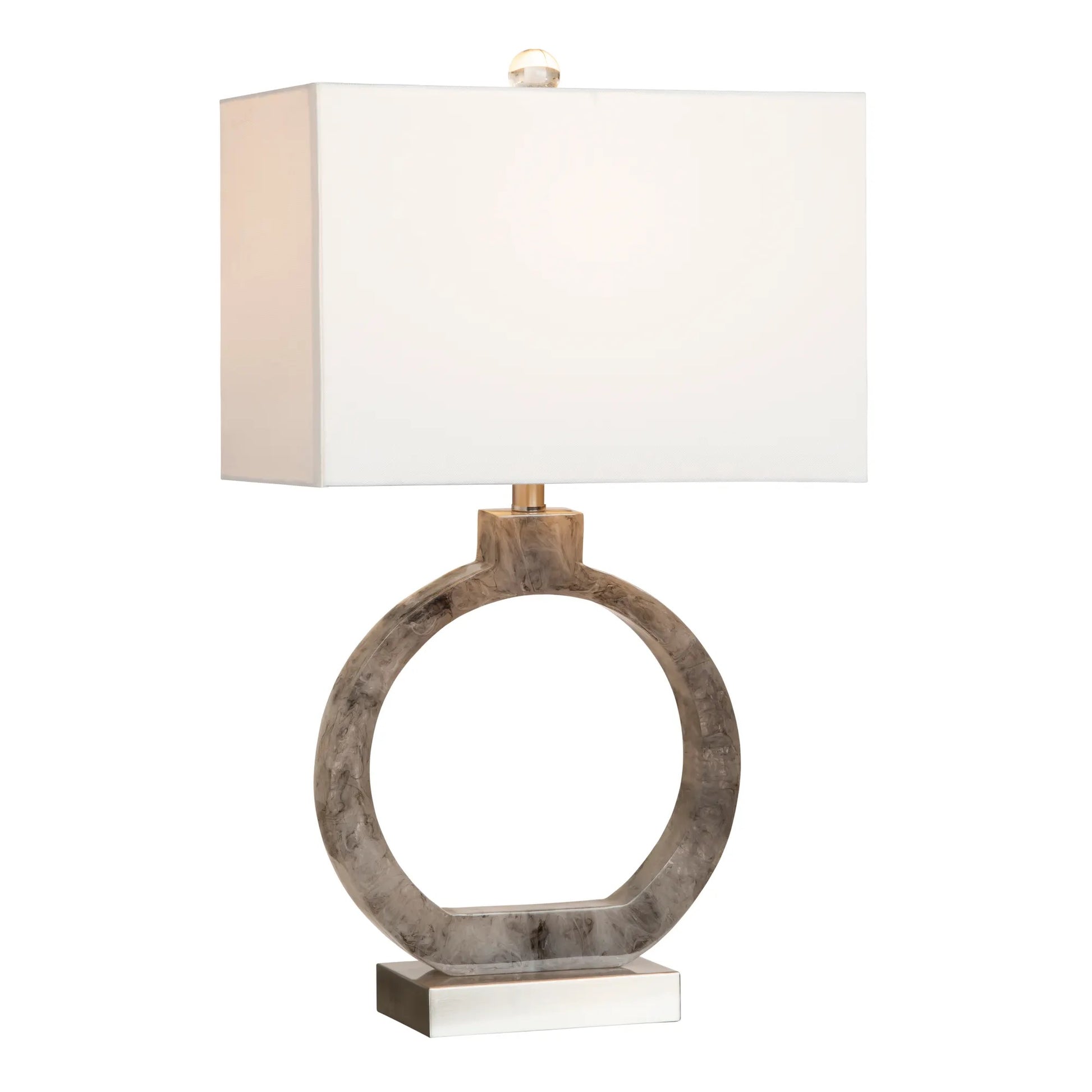 The M Décore Winthrope Table Lamp boasts beautifully cut and polished stone in its never ending circle. The bottom of the base is rectangular to give this piece stability and it is darker to accentuate the light stone of the circle that is crowned with another circular piece that holds the white, linen shade and makes the lamp 28.75-inches tall. As with all natural stone, each piece will be unique. The 3-way bulb capability will give you the ideal amount of light for what you want to accomplish; softer for relaxing or bright for reading or doing crafts. This intriguing table lamp will be ideal for your transitional style home or office decor.